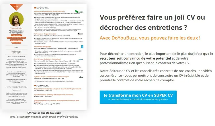 Votre CV DoYouBuzz vous accompagne à chaque instant de votre vie professionnelle pour vous aider à trouver un emploi ou développer votre carrière...